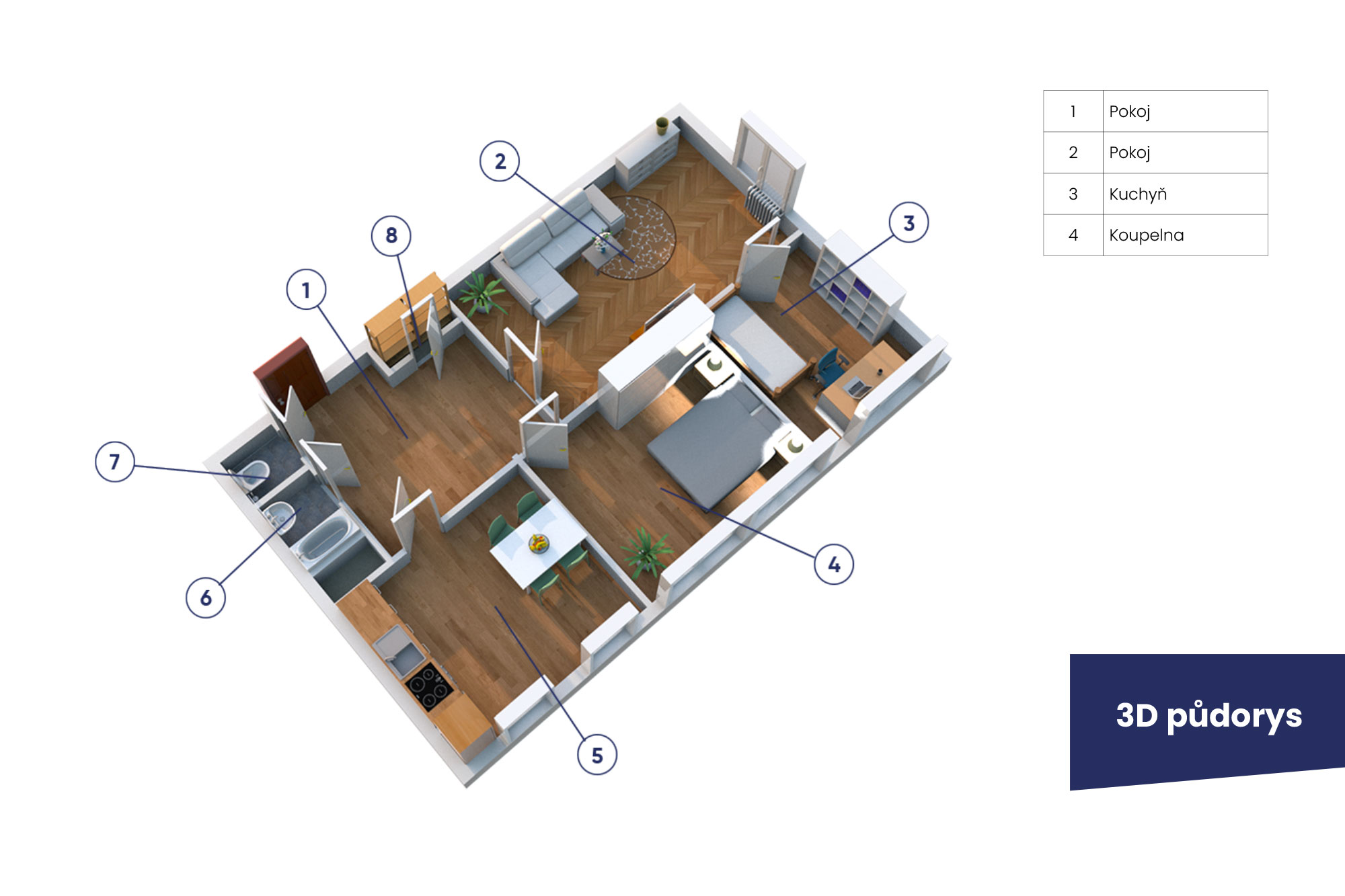 Současně je byt řešen jako 3+1, nicméně pro lepší představu o možnostech prostoru jsme připravili vizualizace, které ukazují, jak by bylo možné byt propojením obývacího pokoje s kuchyní upravit na moderní 3+kk.