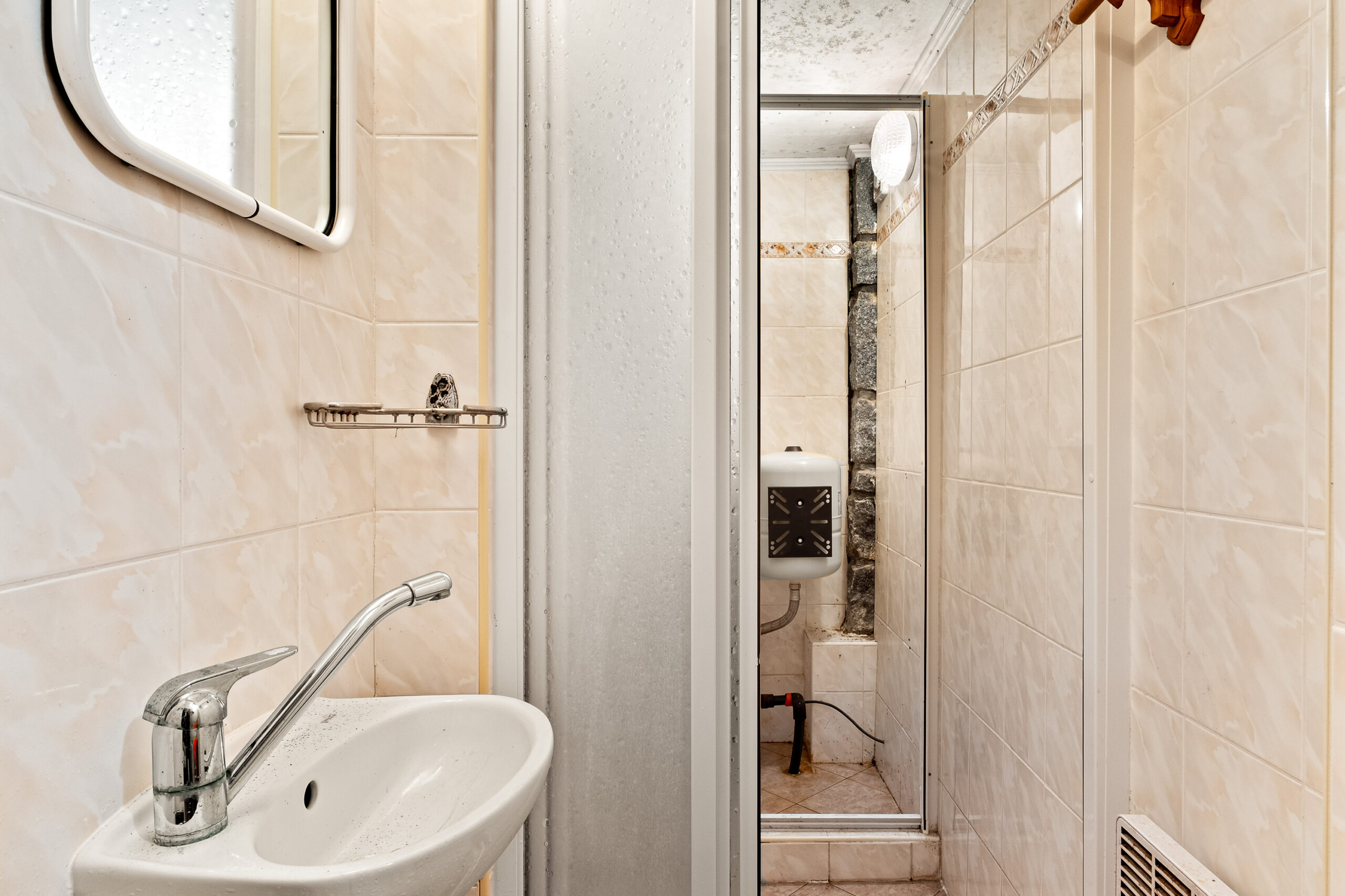 Z chodby vede vstup na samostatnou toaletu, v suterénu je poté koupelna se sprchovým koutem a bojlerem, a také malý sklípek, ideální na uskladnění potravin, vína nebo dřeva.