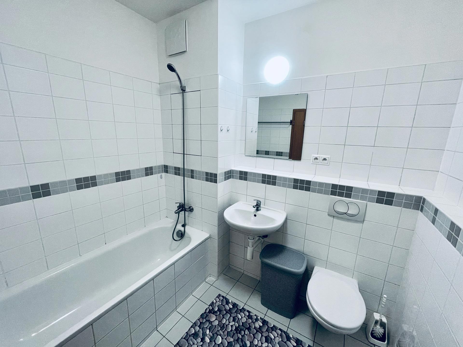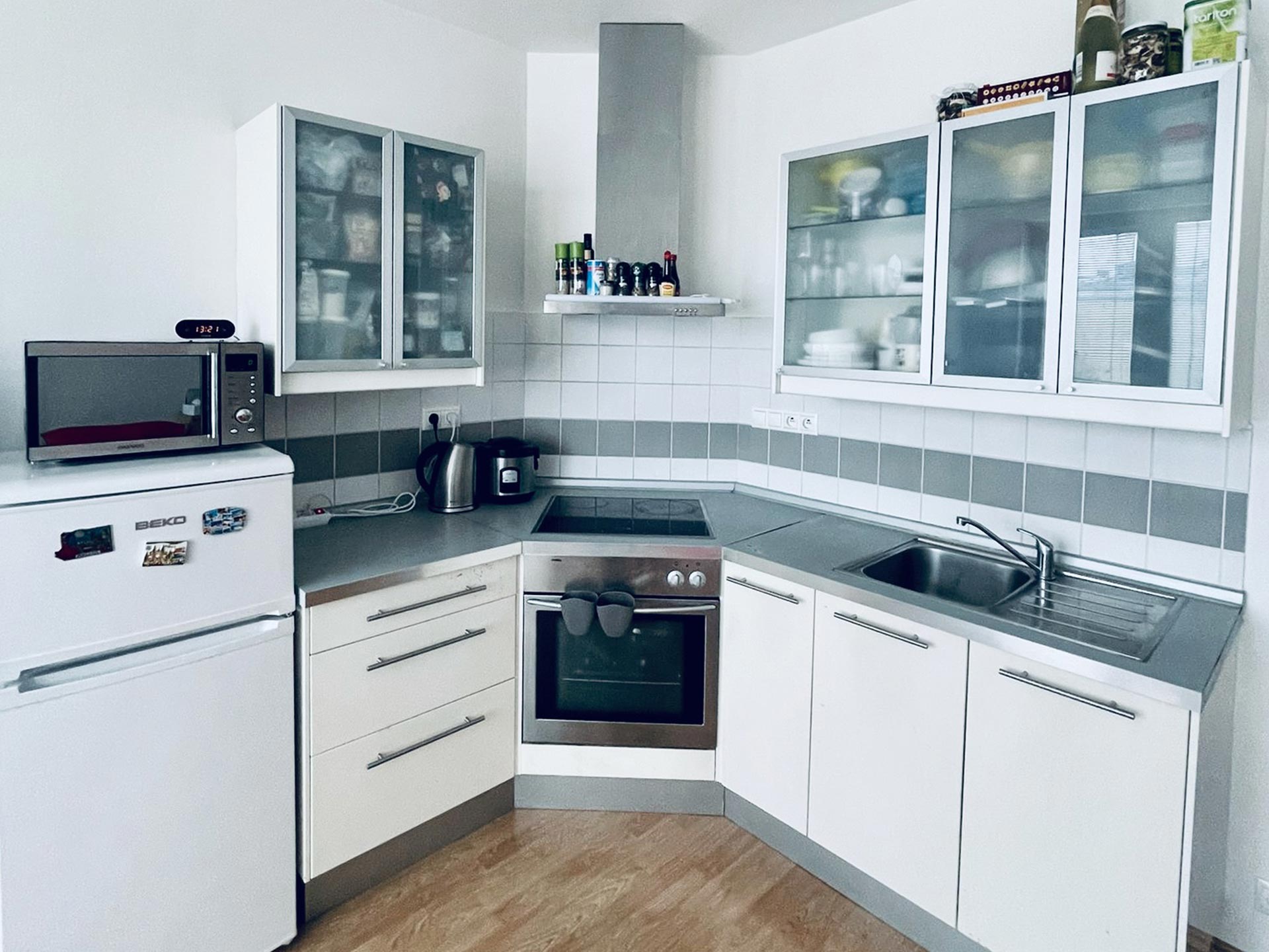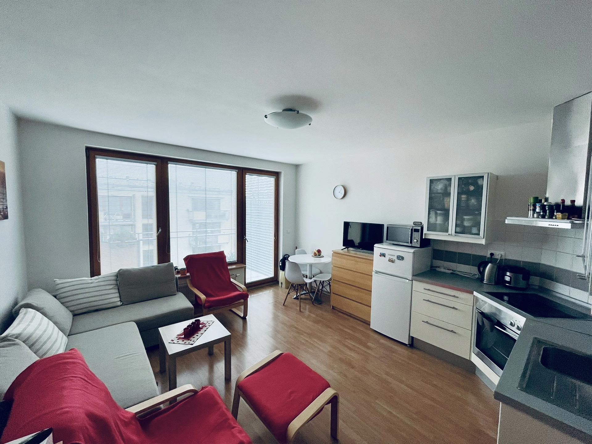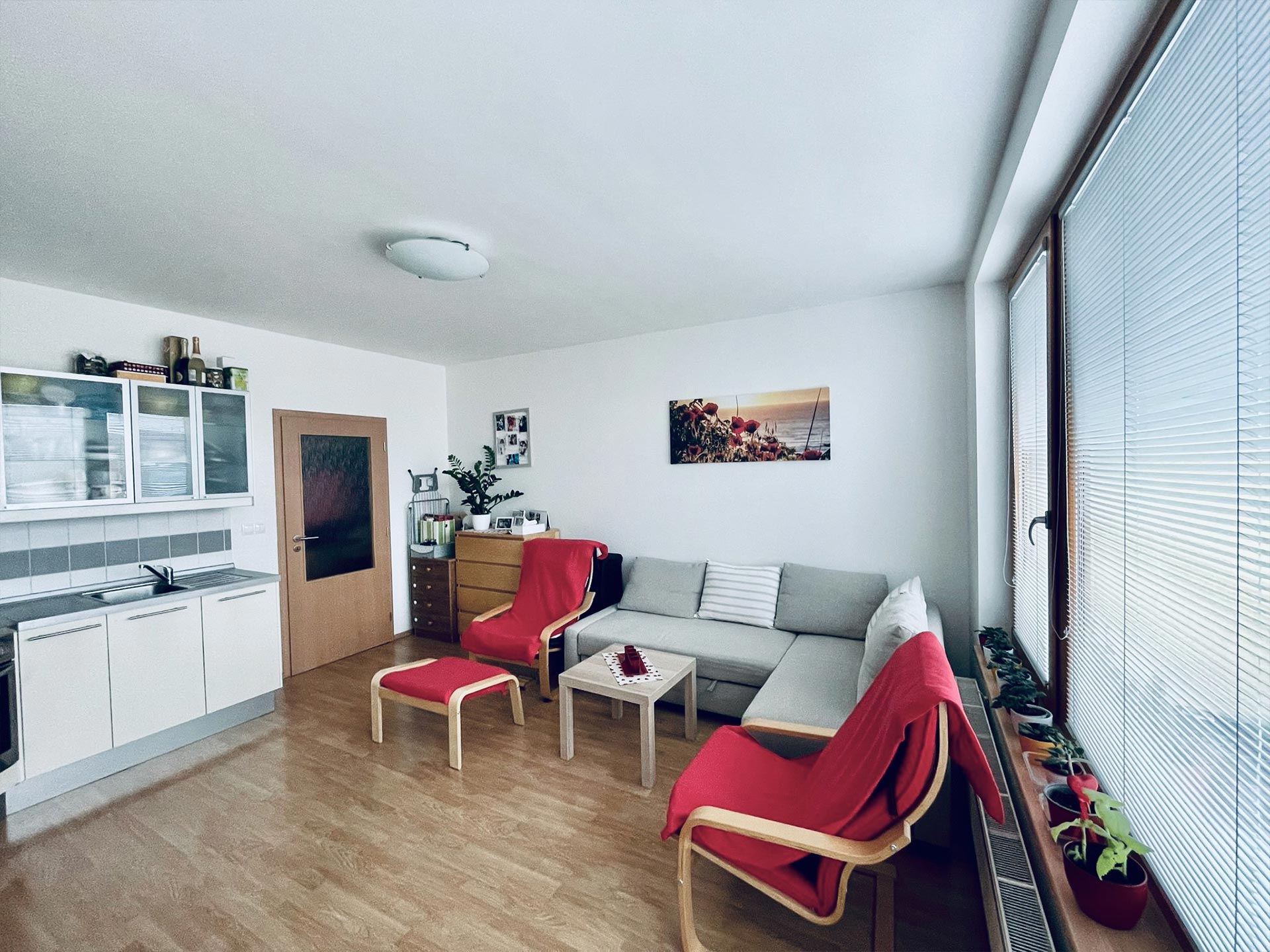 Za vstupními dveřmi se nachází předsíň, z níž je přístupná koupelna s vanou, umyvadlem a toaletou, a dále obývací pokoj s kuchyňským koutem a výstupem na balkon. Moderní kuchyňská linka je vybavena, sporákem, troubou, lednicí a digestoří. K bytu náleží sklep a venkovní parkovací stání.