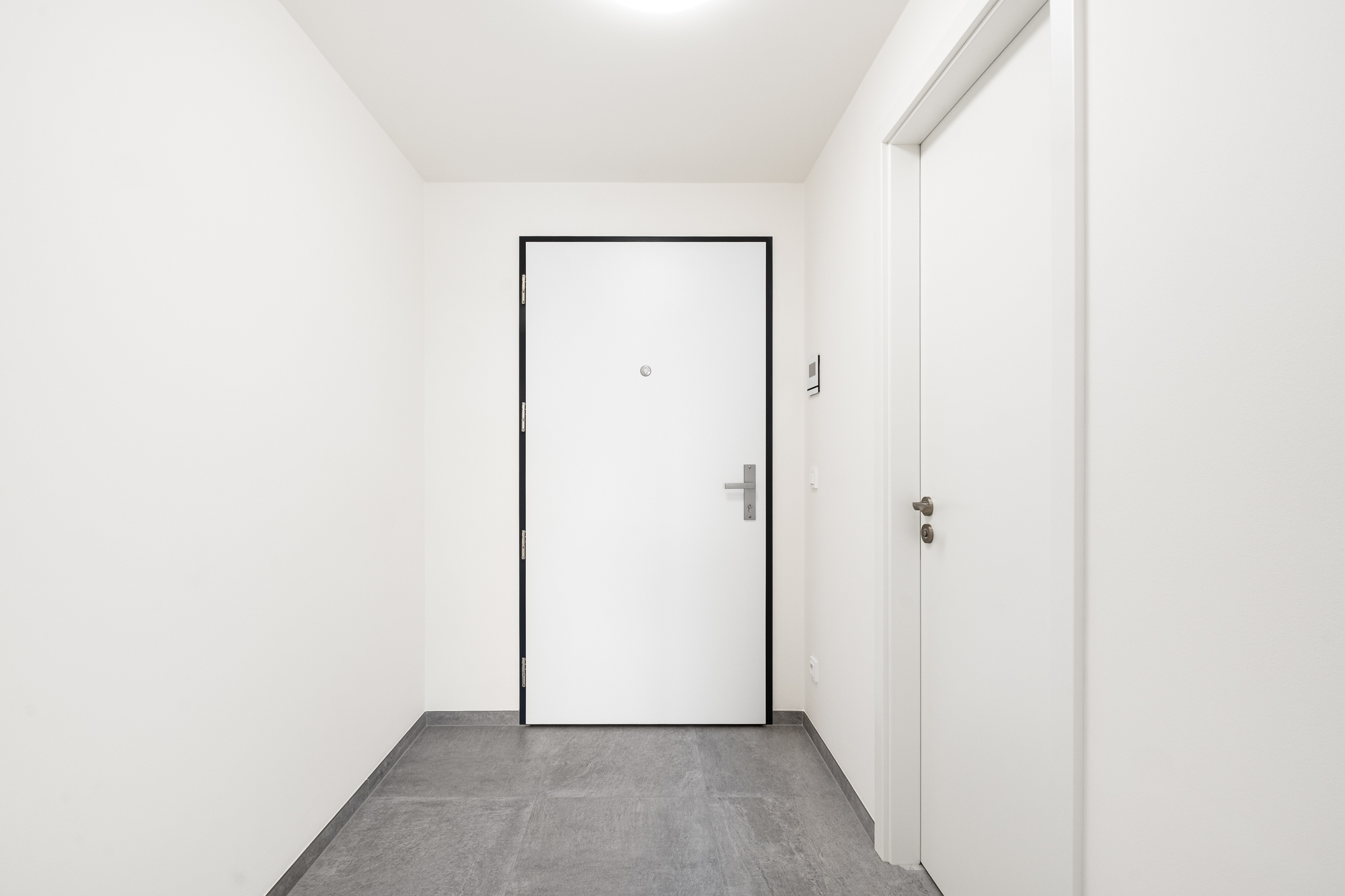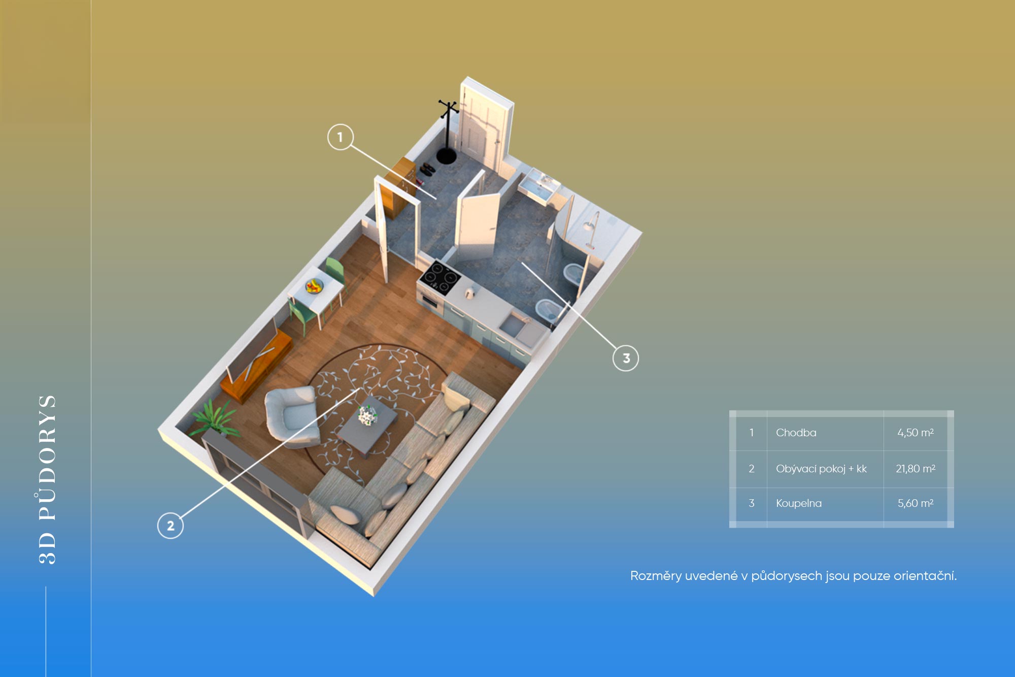 Po vstupu do bytu se nacházíte v prostorné chodbě, ze které je přístup do koupelny a dále do hlavní obytné místnosti s kuchyňským koutem.