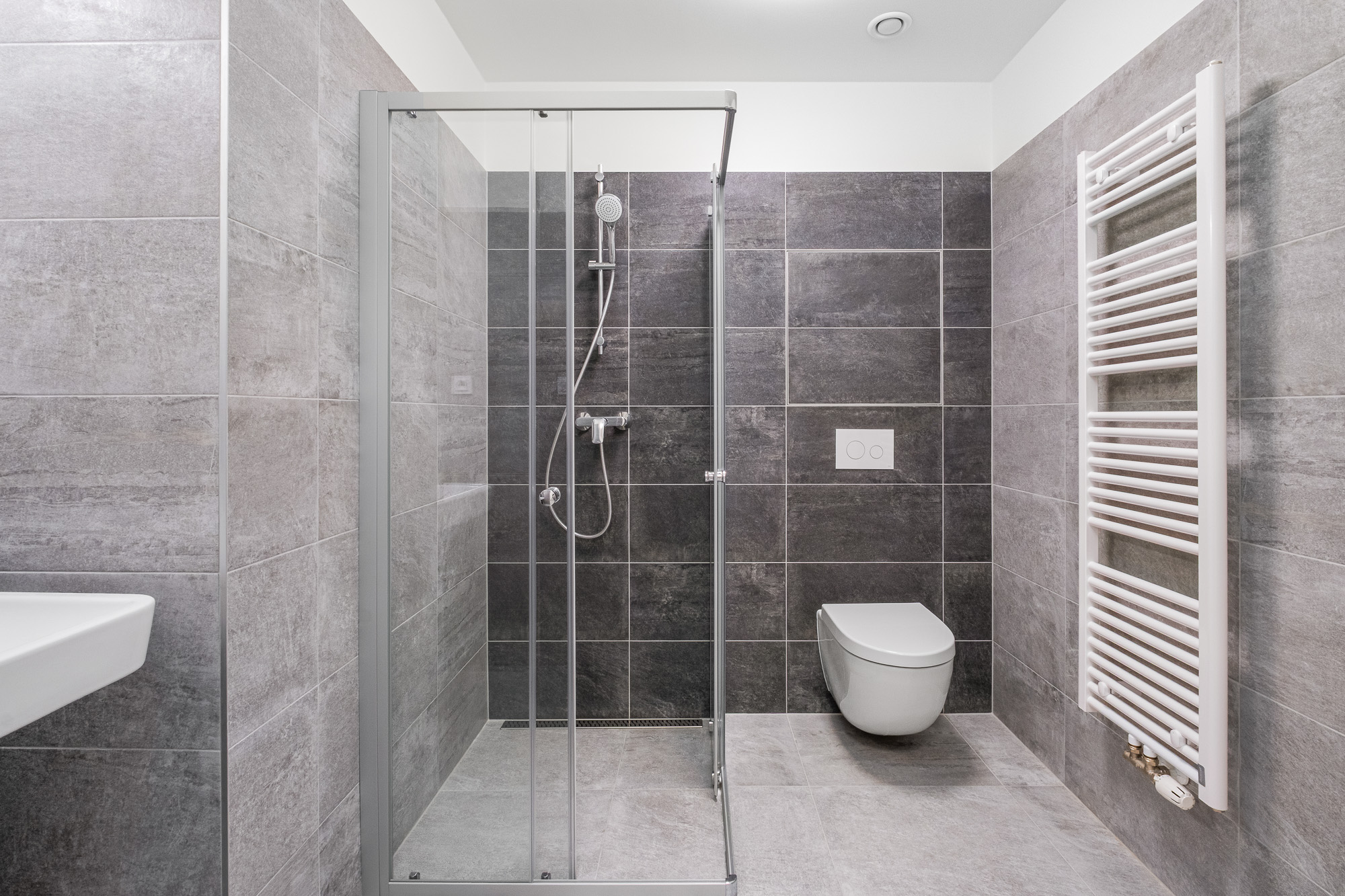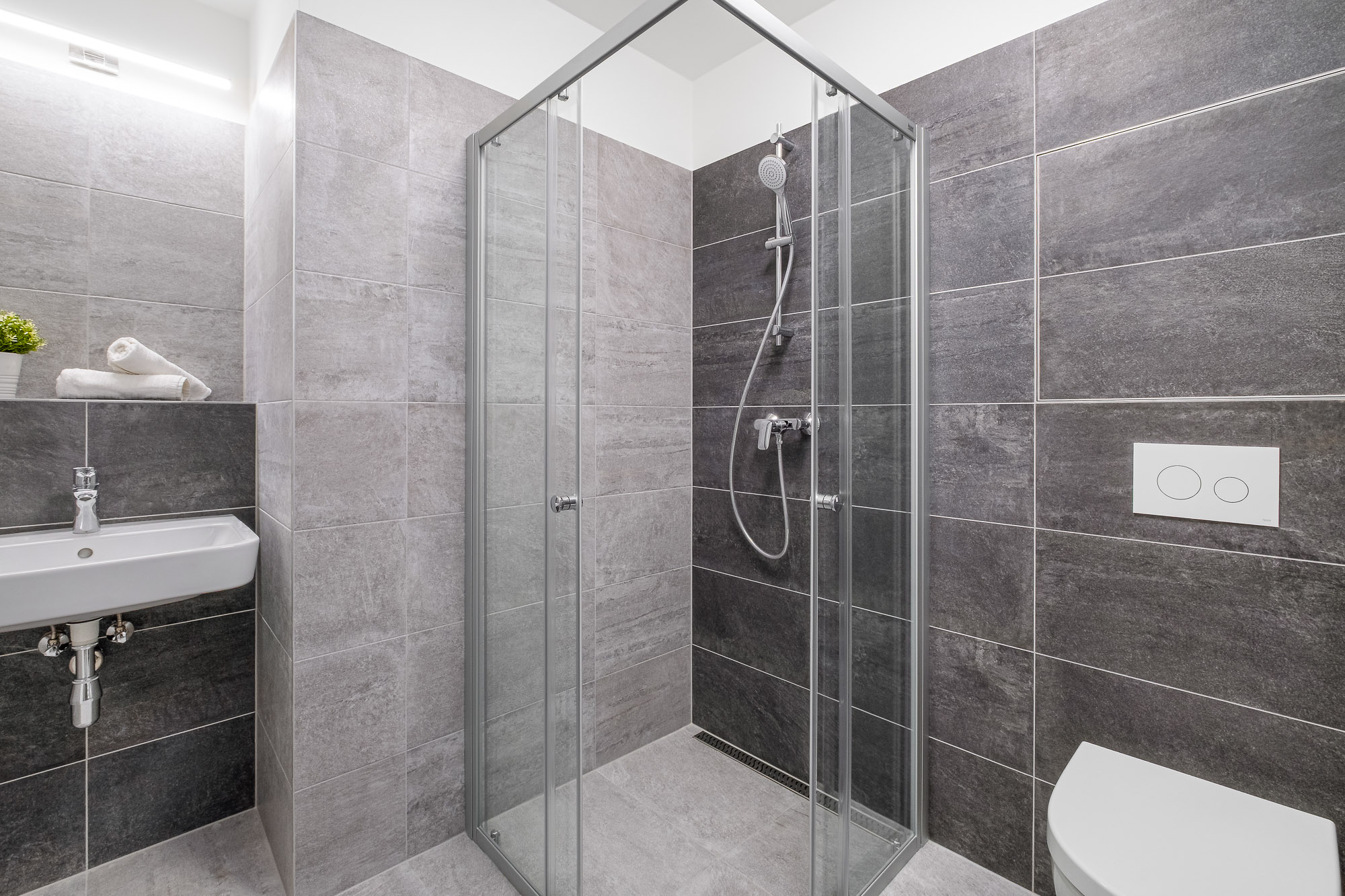 Koupelna je vybavena sprchovým koutem, toaletou, umyvadlem a zrcadlem.