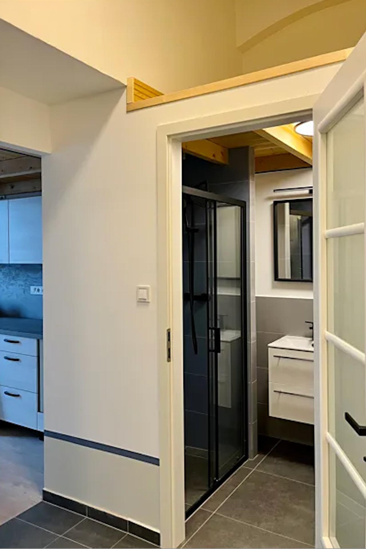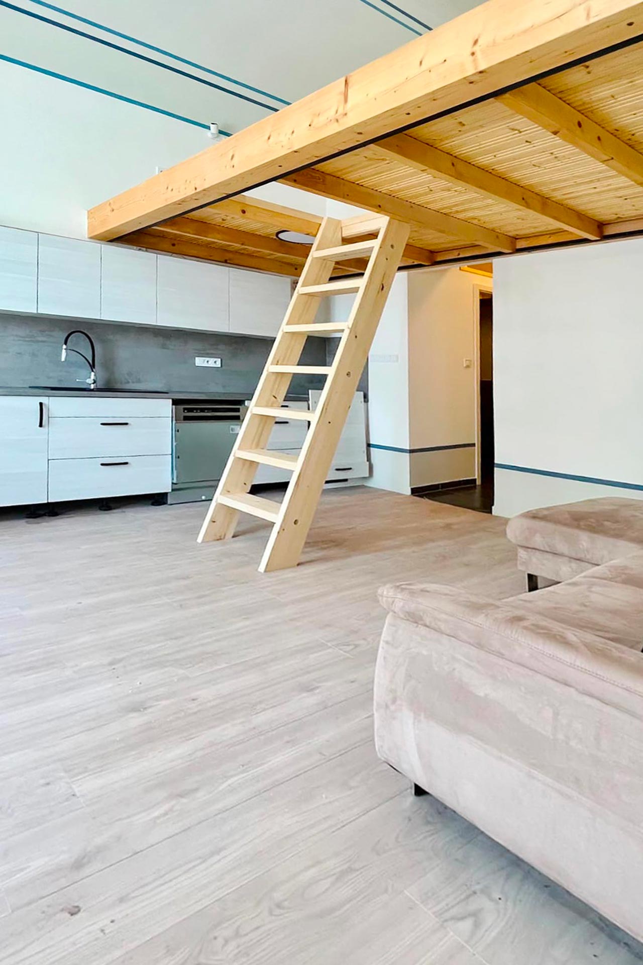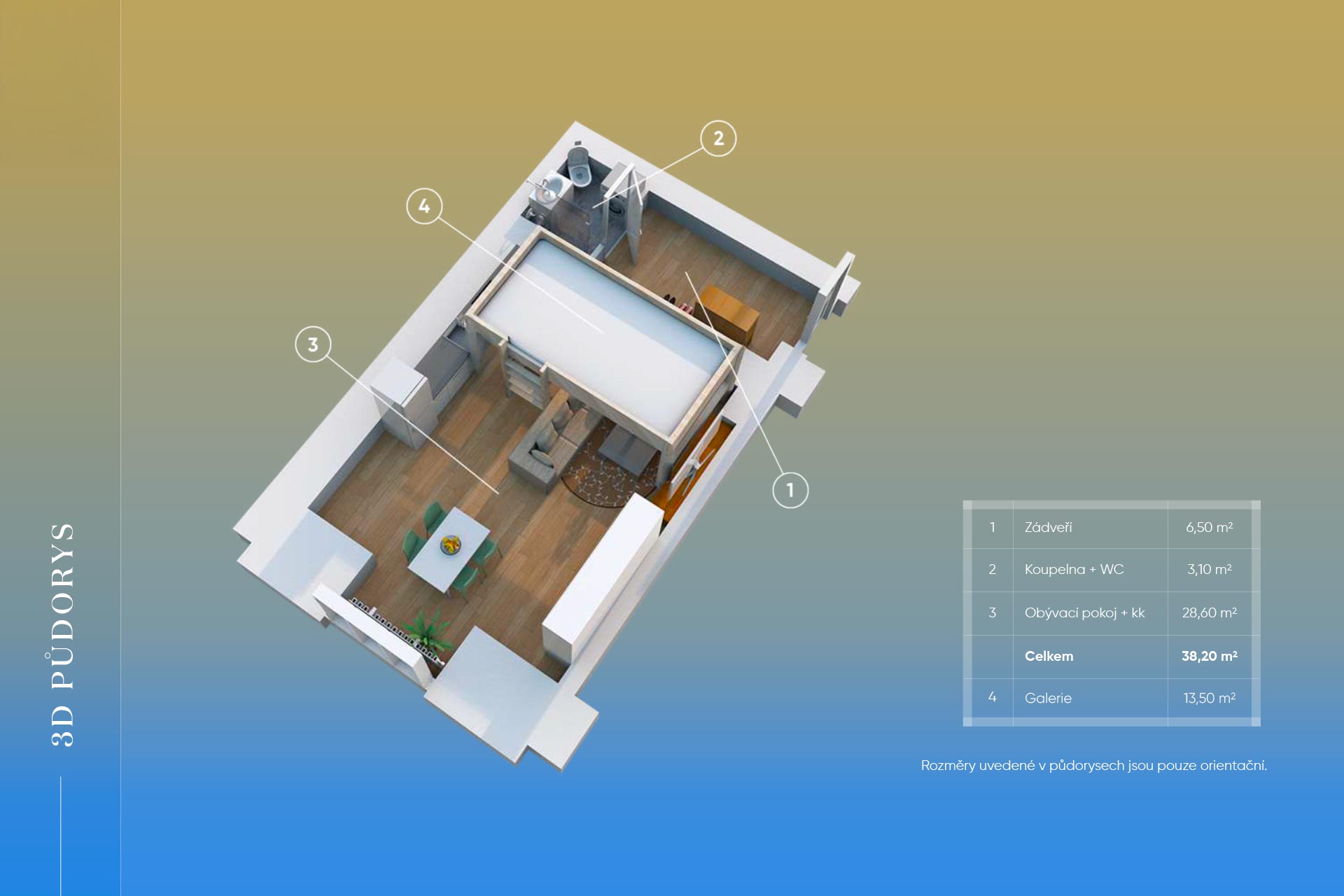 Byt je v 1. NP z celkem tří a má dispozici 1+kk, s celkovou podlahovou plochou vč. příslušenství 52 m2. Za vstupními dveřmi se nachází chodba, z níž je přístupný obývací pokoj s kuchyňským koutem a koupelna se sprchovým koutem a toaletou. V obývacím pokoji je prostorná galerie o ploše 14 m2, která nájemníkům zabezpečí pohodlné a klidné spaní.