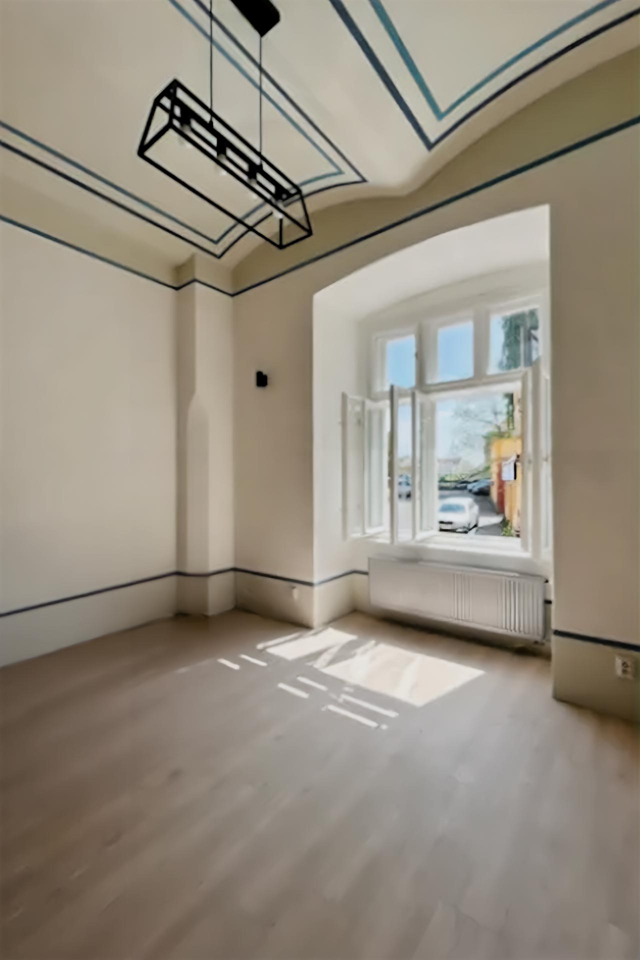 Byt, stejně jako dům, prošel kompletní rekonstrukci a je v bezvadném stavu. Rekonstrukce byla prováděna citlivě se zachováním původních prvků, za použití kvalitních materiálů a byla dokončena v prosinci roku 2024. Na podlaze repasované dubové parkety, v koupelně dlažba.