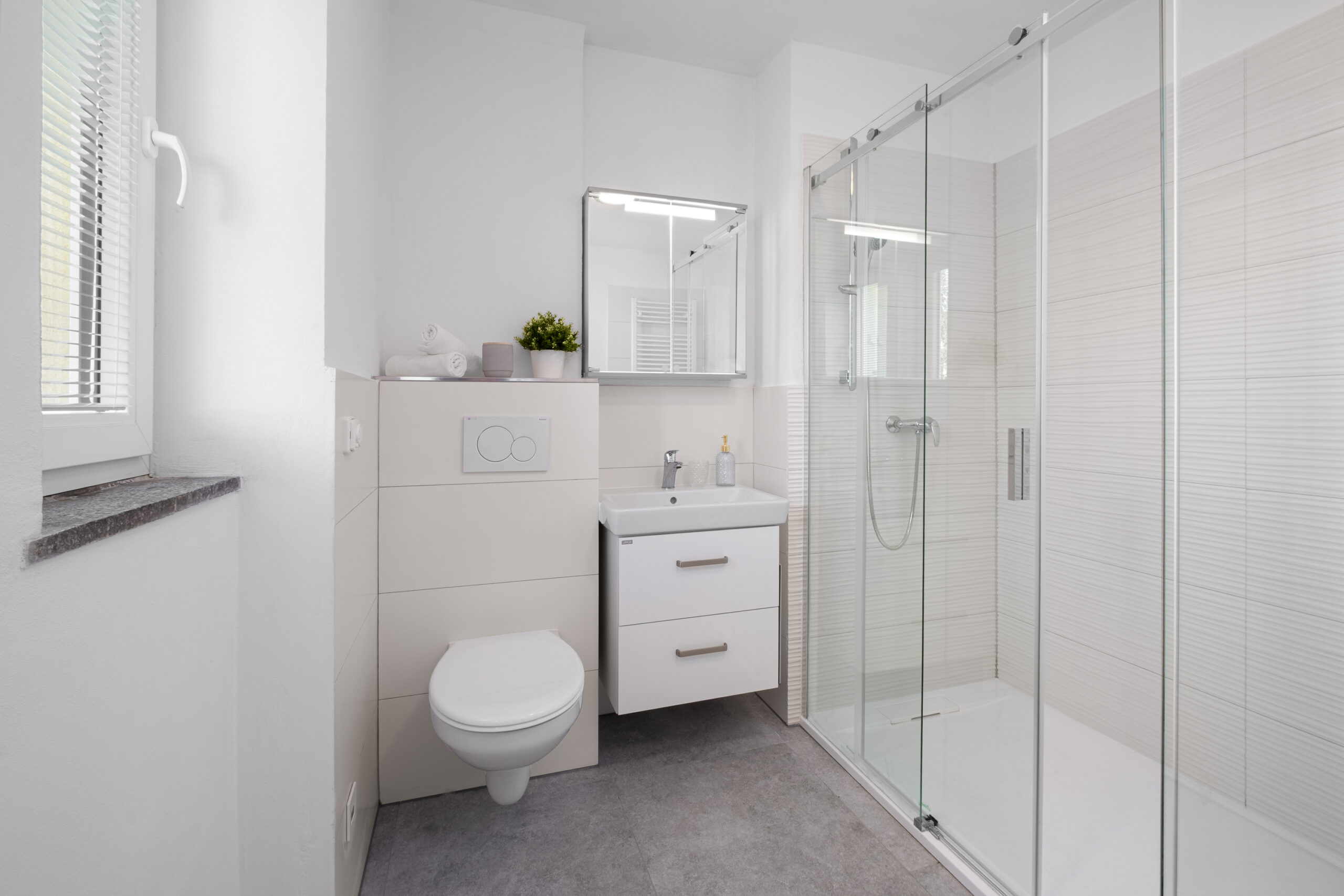 Vstupní chodba je prostorná a praktická – je zde dostatek místa pro vestavěnou skříň nebo větší úložný nábytek. Po pravé straně se nachází moderní koupelna s velkým sprchovým koutem, toaletou, umyvadlem se zrcadlem, vlastním elektrokotlem a bojlerem.