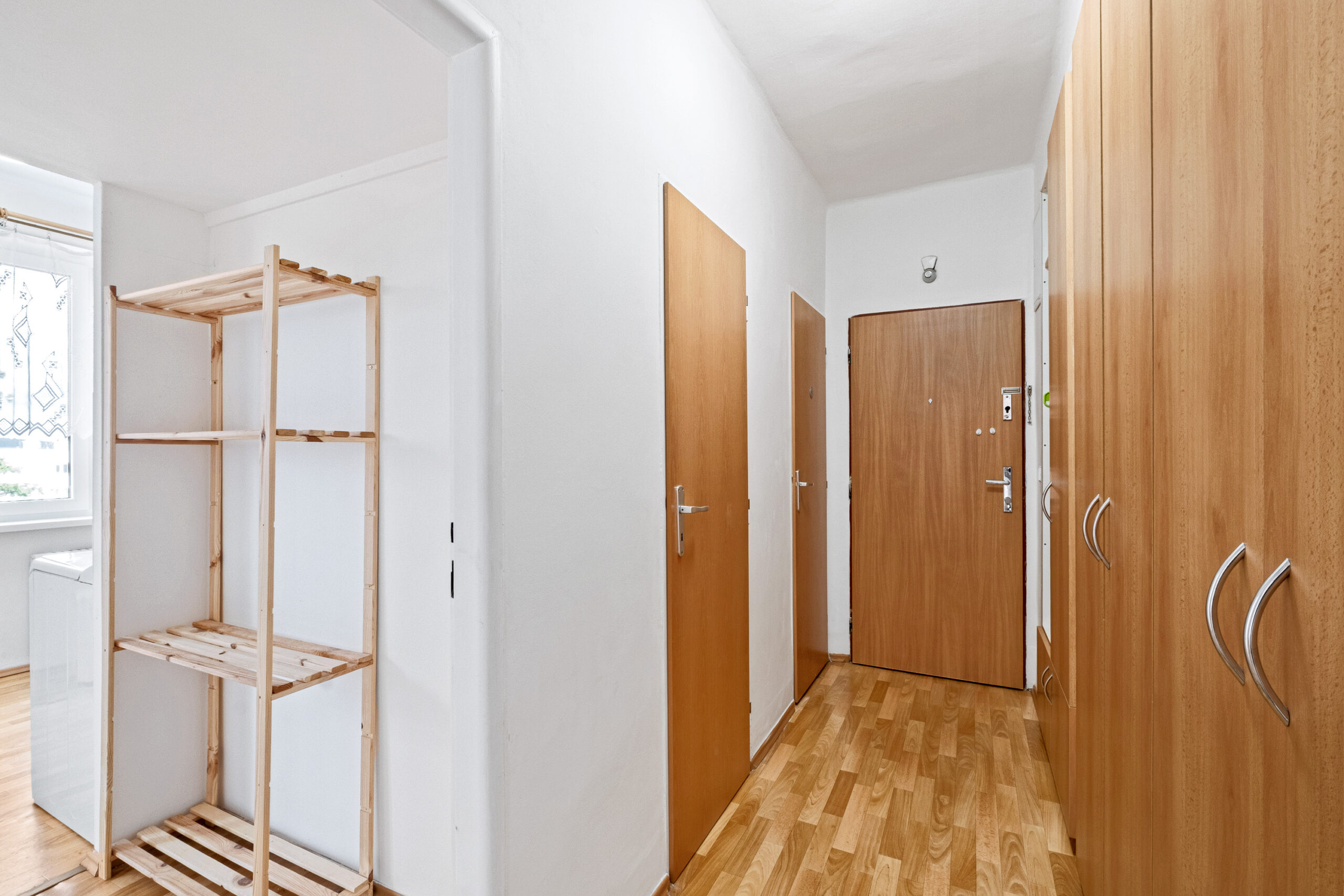 Bytová jednotka je dispozičně řešena jako 2+1. Za vstupními dveřmi se nachází chodba s vestavěnými skříněmi, z níž je přístupná ložnice, kuchyň, koupelna s vanou a samostatná toaleta. Ložnice je průchozí do obývacího pokoje s balkonem. Kuchyň je vybavena kuchyňskou linkou se sporákem, lednicí a pračkou.