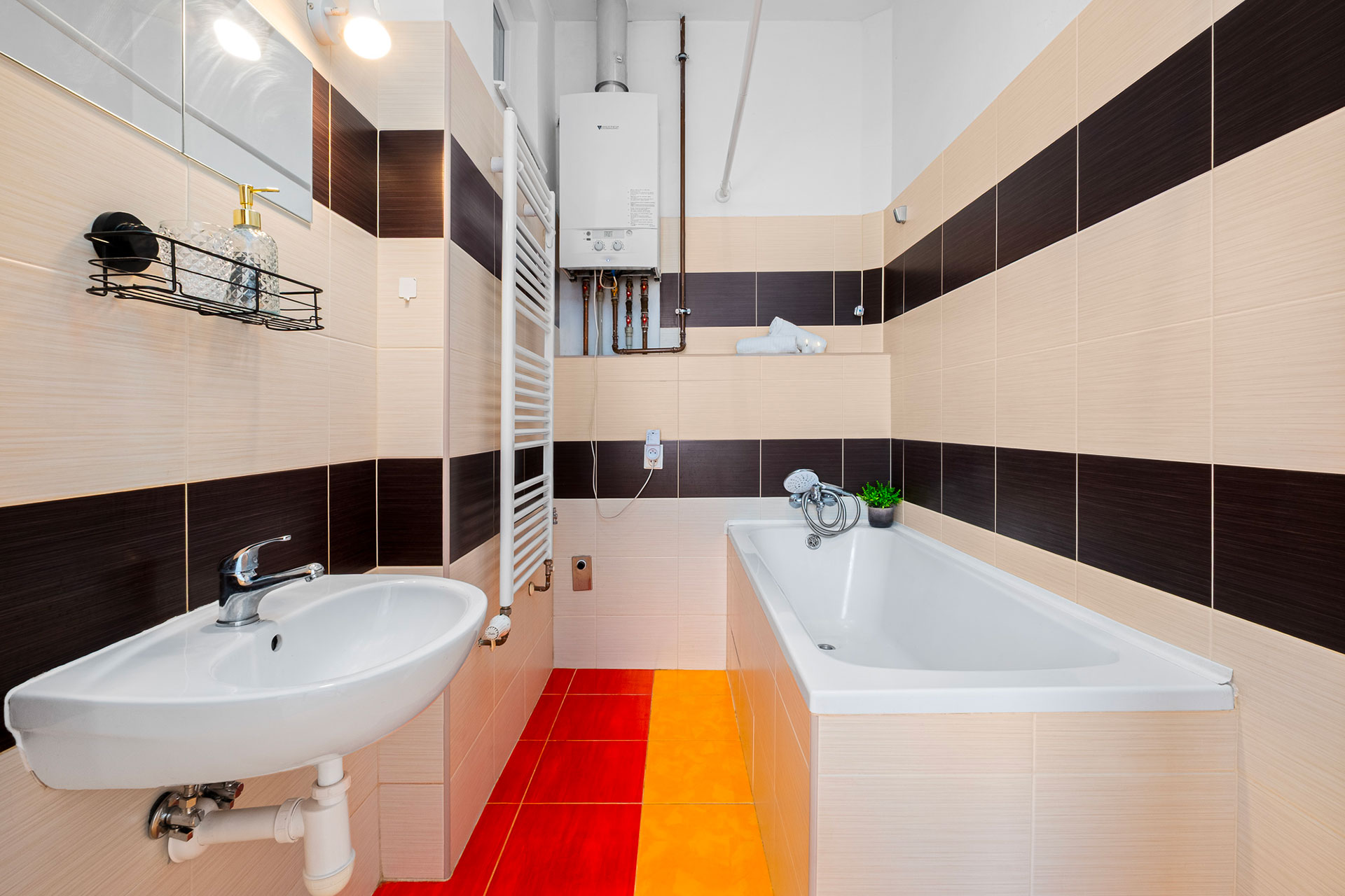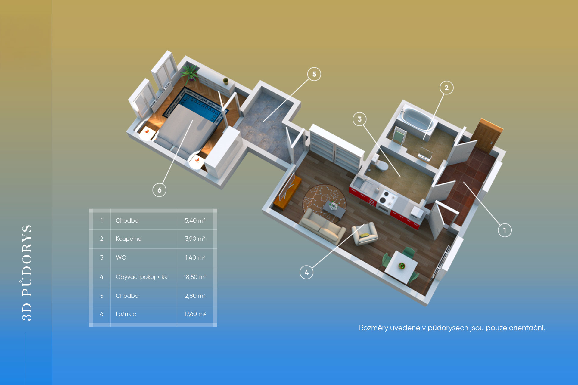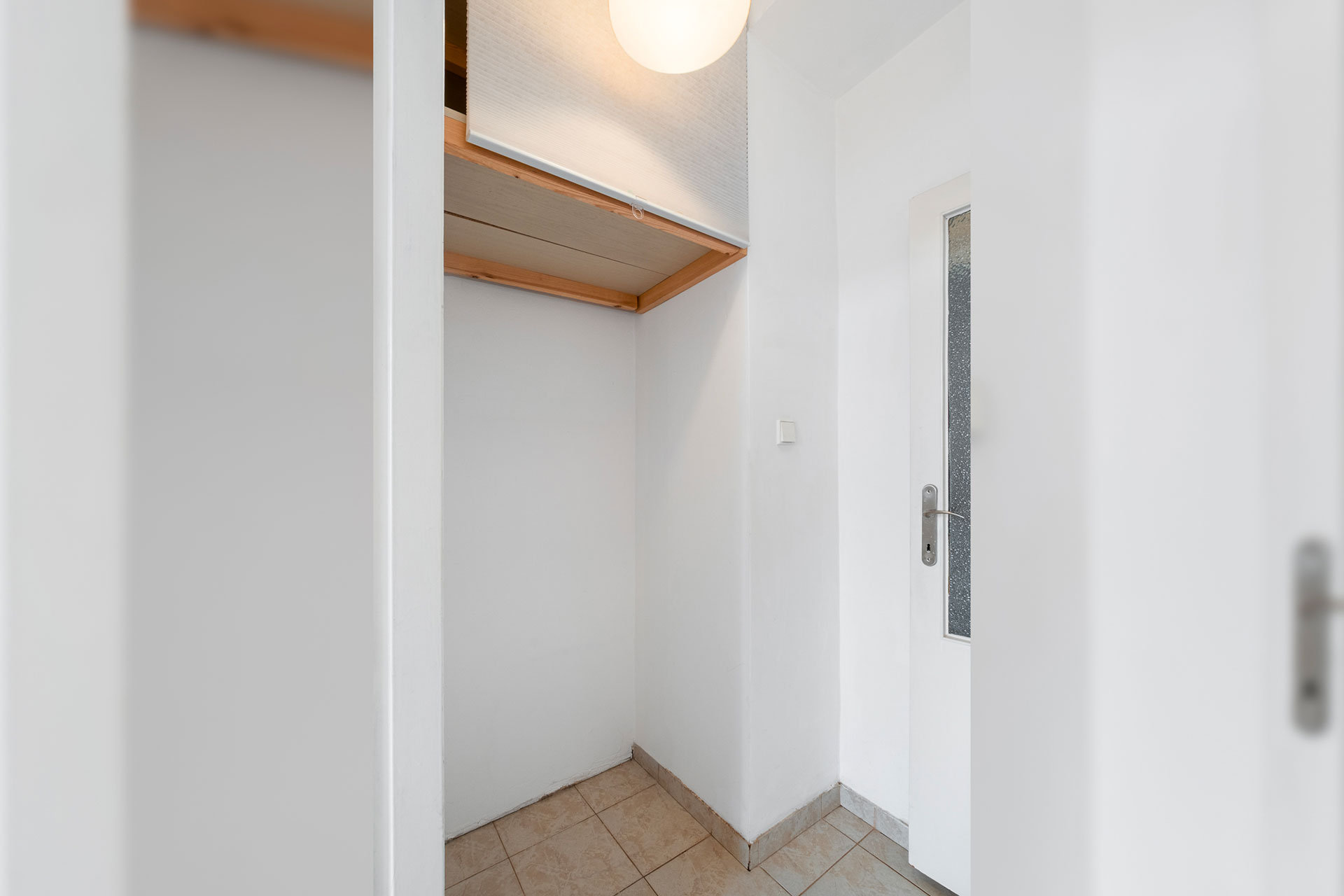 Dispozice bytu je praktická a zároveň velmi příjemná. Vstup vede do prostorné a světlé chodby, z níž je přístup do koupelny s vanou a umyvadlem, na samostatnou toaletu a dále do obývacího pokoje s kuchyňským koutem vybaveným plynovým sporákem. Z obývacího pokoje se vchází do ložnice, jejíž okno směřuje na jihovýchod a nabízí přímý výhled do zeleně Grébovky. Obývací pokoj s kuchyní je orientován na severozápad, což zajišťuje dostatek světla bez přehřívání v letních měsících.