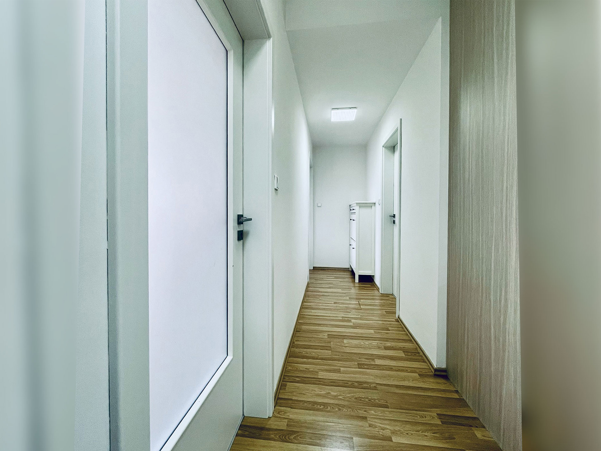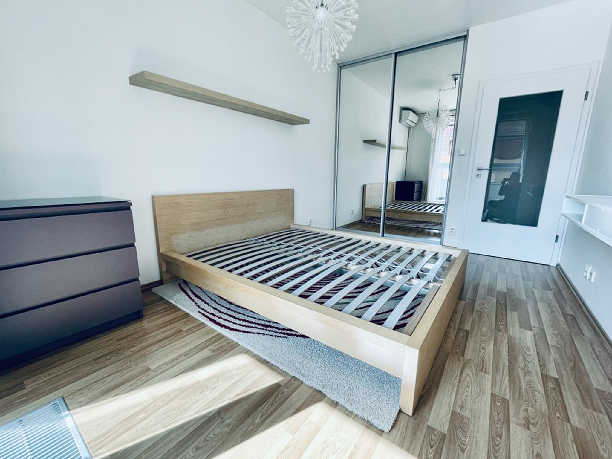 Za vstupními dveřmi se nachází předsíň, z níž je přístupný prostorný obývací pokoj s kuchyňským koutem, dále ložnice a koupelna s vanou, toaletou a pračkou. Kuchyňská linka je vybavena elektrickou varnou deskou, troubou, myčkou nádobí a lednicí s mrazákem. V ložnici a v předsíni jsou praktické vestavěné skříně na míru s množstvím polic a šuplíků. K dispozici je také zasklená lodžie a klimatizace. Ve vnitrobloku je udržované dětské hřiště se skluzavkou, pískovištěm a prolézačkami.
