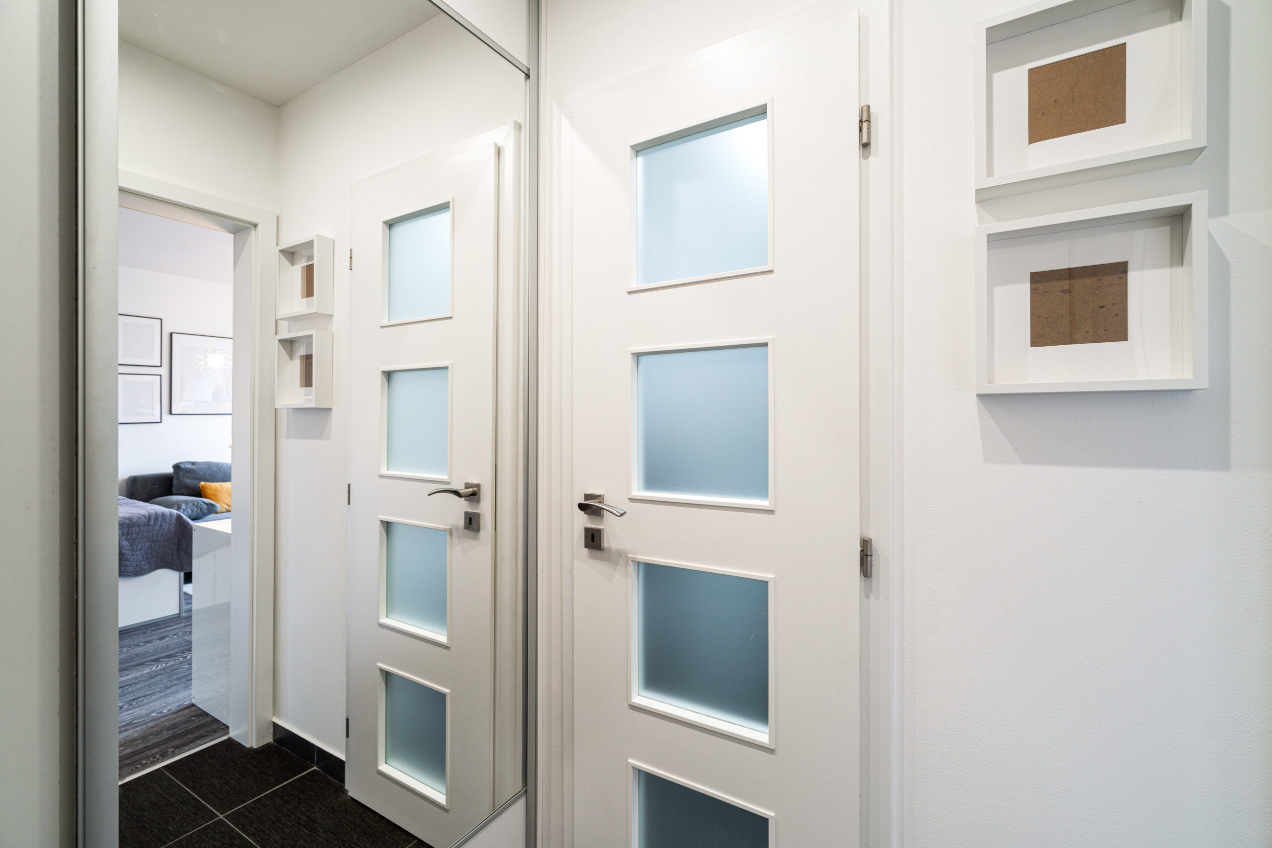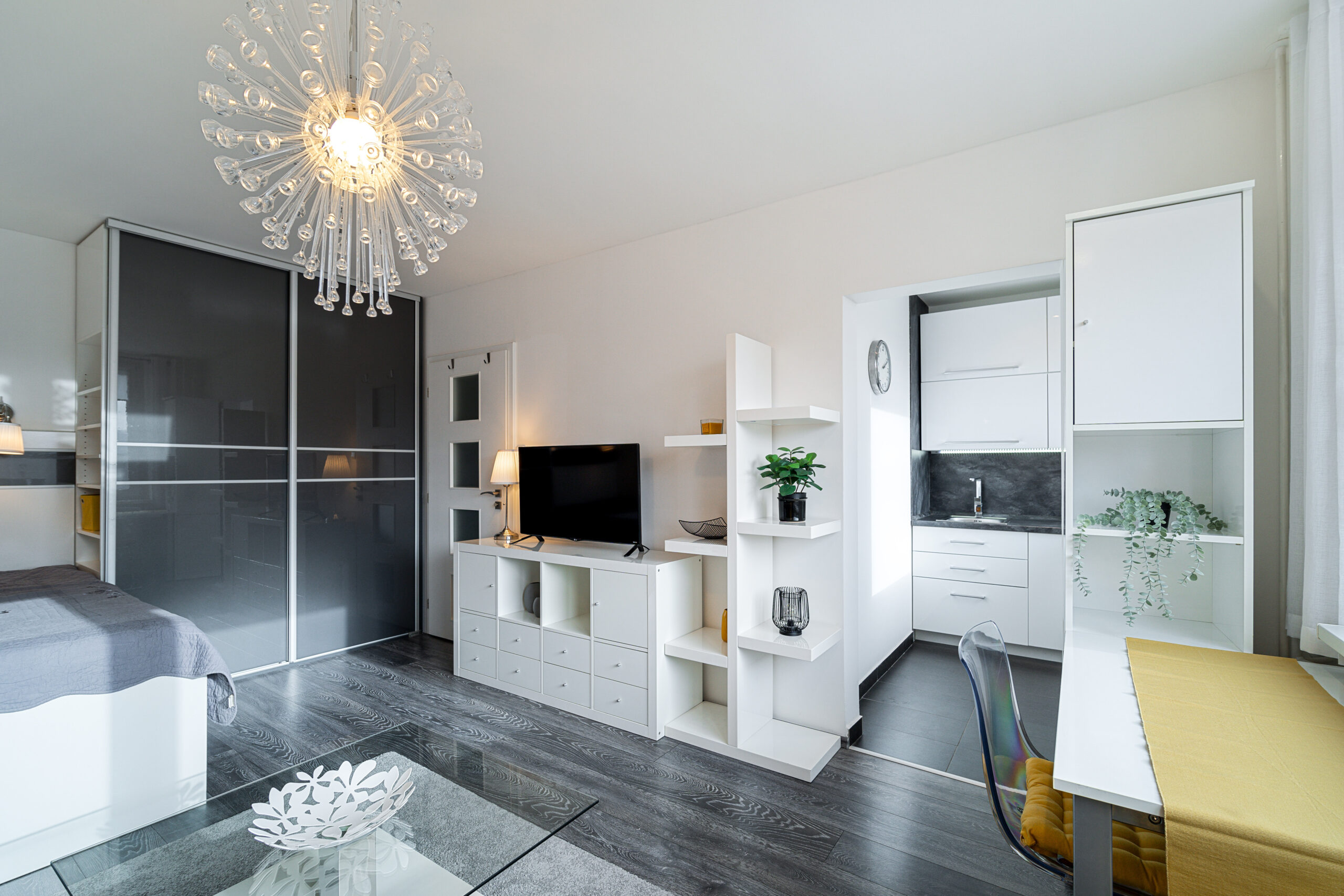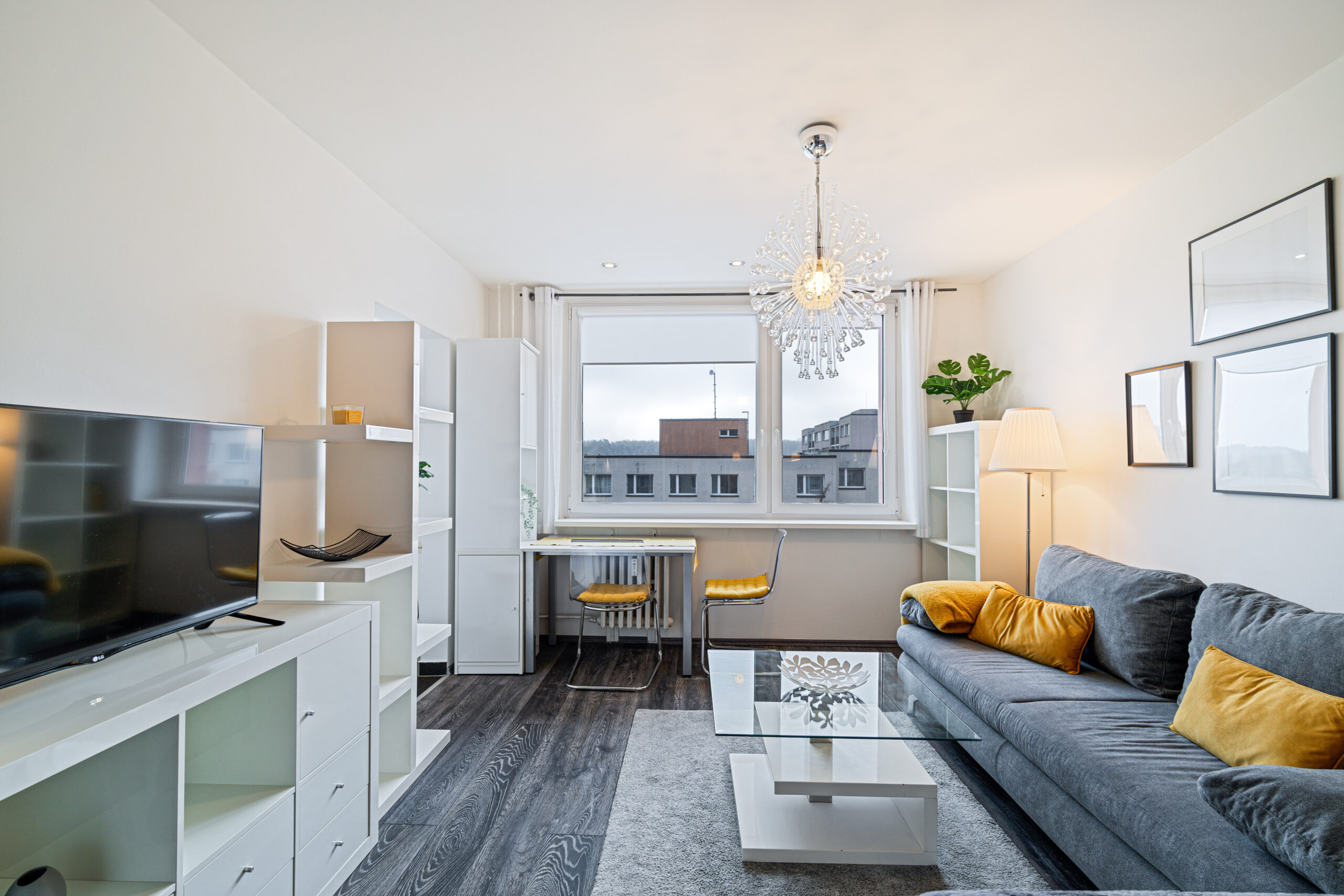 Bytová jednotka se nachází v 8. NP z devíti panelového domu. Za vstupními dveřmi se nachází předsíň, ze které je možné vstoupit do koupelny se sprchovým koutem a toaletou, a dále do prostorného obývací pokoje, na který navazuje kuchyň. Moderní kuchyňská linka je vybavena horkovzdušnou troubou, sklokeramickou deskou, lednicí s mrazákem.
