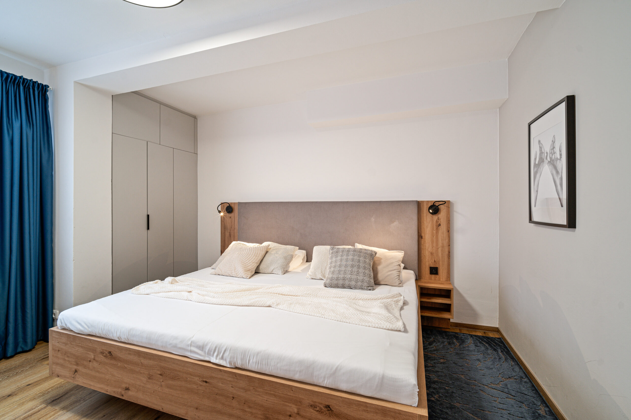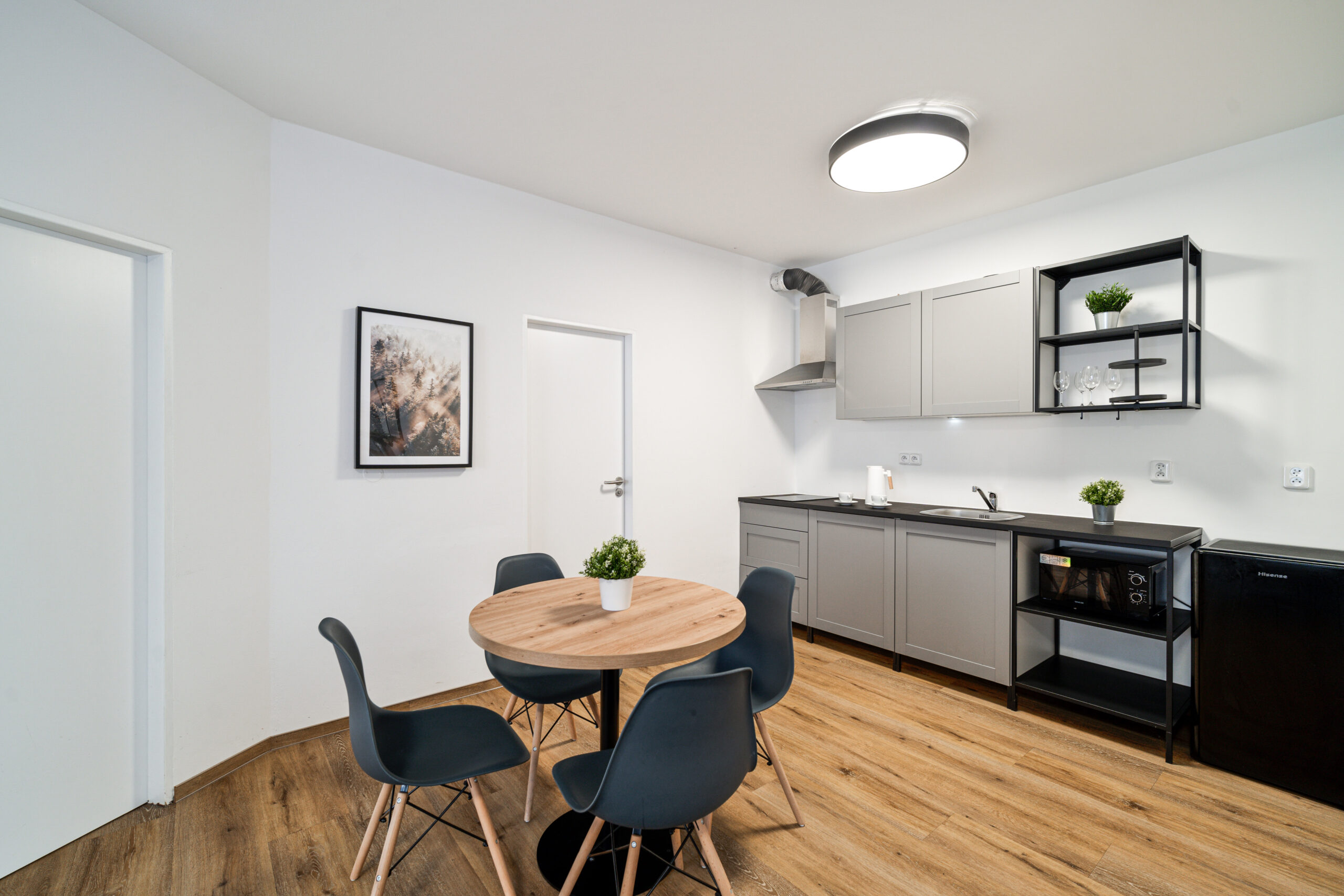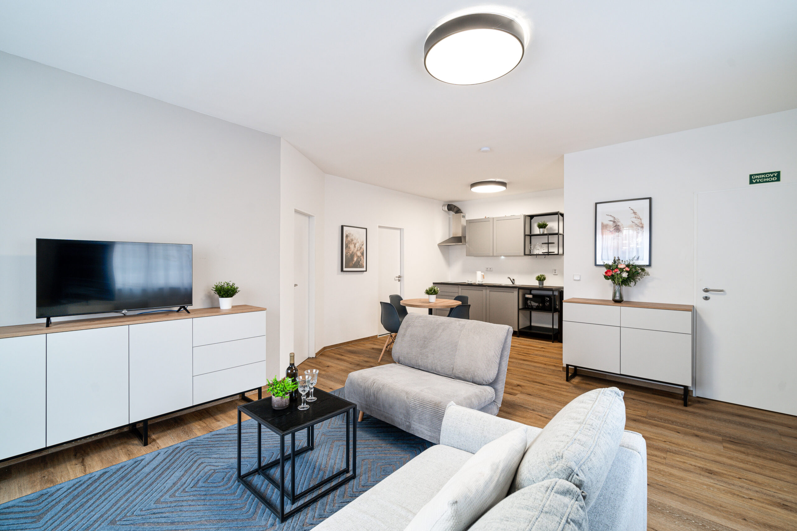 Bytová jednotka je dispozičně řešená jako 2+kk. Za vstupními dveřmi se nachází předsíň a za ní obývací pokoj s kuchyňským koutem. Z něj je potom přístupná ložnice, koupelna, na kterou navazuje šatna a samostatná toaleta.