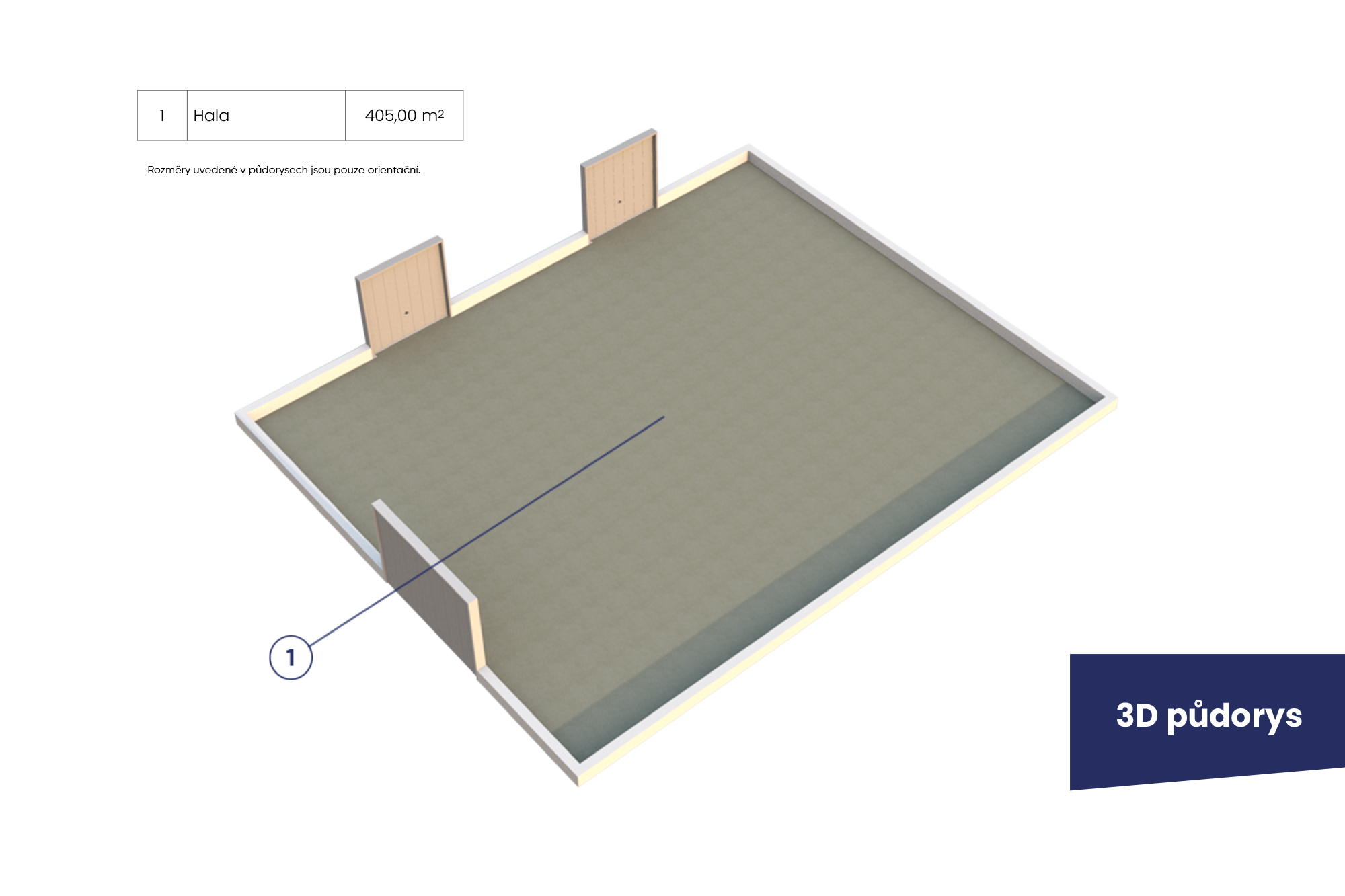 Hala má rozměry cca 22,5 × 18 m a výšku 5 metrů. Díky svým parametrům je ideální pro autoservis, pneuservis, lehkou výrobu nebo skladování.